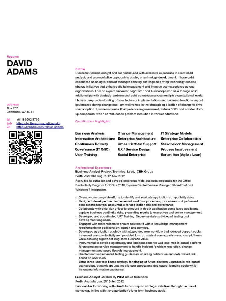 Business Analyst Resume Australia. Deliver business analysis on high profile projects across a variety of sectors and industries for some of Australia's leading organisations. Tired of rewriting you Business Analyst resume every time its gets rejected by a non-technical recruiter?