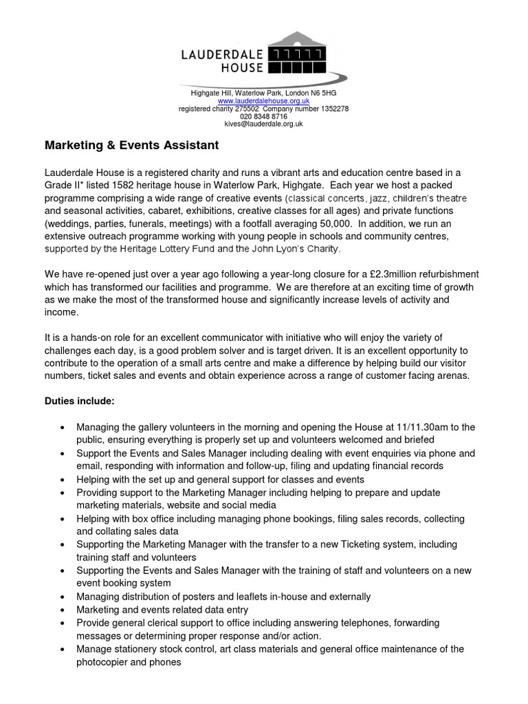 Marketing and Events Assistant - Lauderdale House ...
