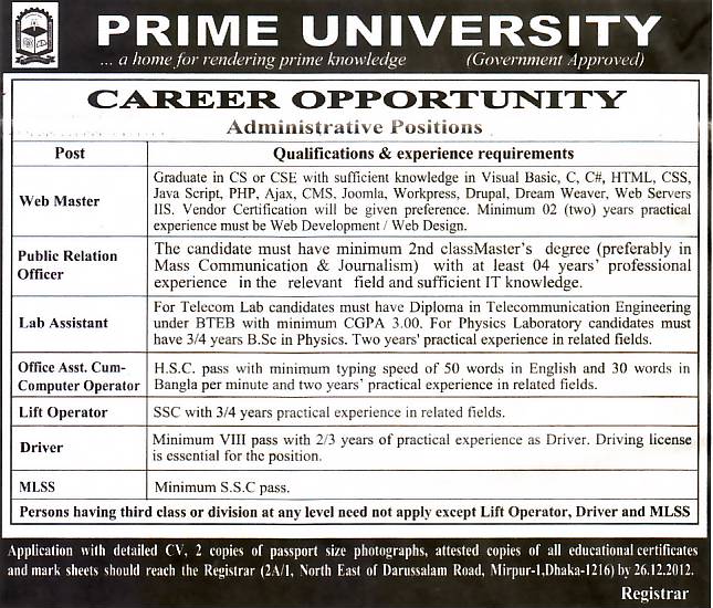 All Newspaper Jobs: Prime University, Post: Web Master ...